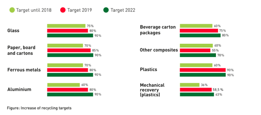 2019新的《德国包装法》致力于防止或减少包装废弃物对环境的影响。这可通过避免产生和回收包装废弃物来实现。特别是《包装条例》中规定的回收配额,自1991年以来没有变化,这已经不能满足现代包装回收和循环利用的需求。