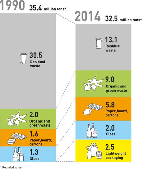 From 1990 to 2014, the quantity of residual waste fell substantially, whereas there was a significant rise in the quantity of separately collected recyclables.